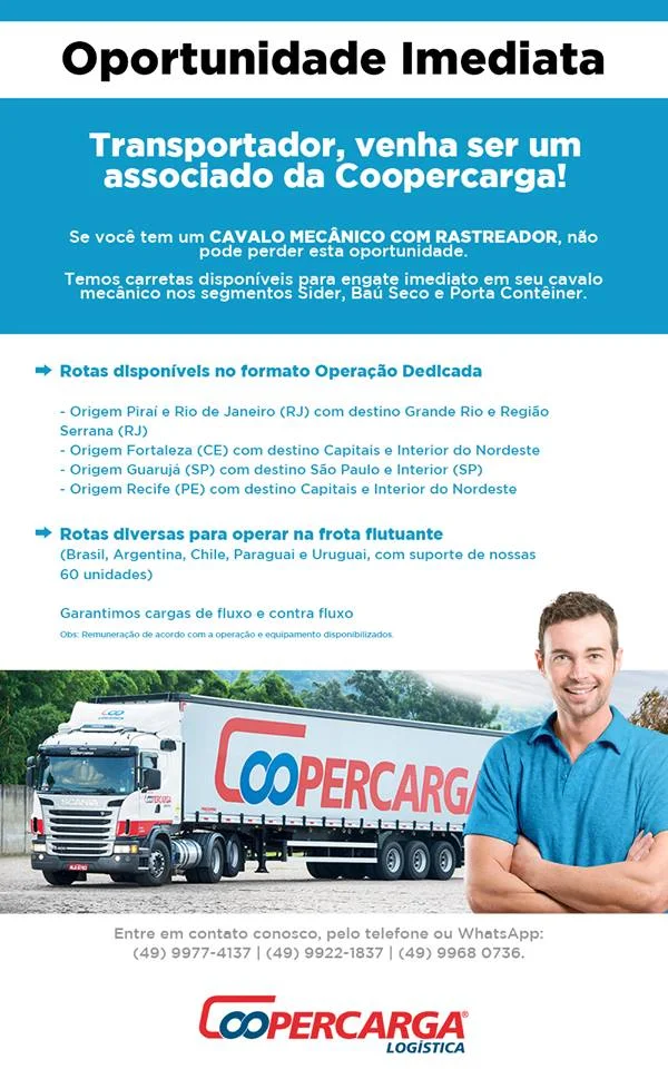 A Coopercarga disponibiliza ainda três formas de contato para os interessados que atendam aos requisitos, (49) 9977-4137, (49) 9922-1837 ou pelo Whatsapp, (49) 9968-0736.